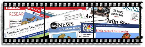 Lab's recent paper "Sex-biased maternal effects..." in Proceedings of the National Academy of Sciences is selected for NSF News (NSF.gov), Nature's Reasearch Highlights, and also featured in Science, UA News, Arizona Daily Star, MSNBC, Tiede (Finland), Radio "Echo of Moscow" (Russia), Discovery Channel-Daily Planet, Poisk Science Newspaper, NetWorld Directory, Discovery Channel-Canada, LiveScience, GSMNews (Russia), El Colombiano (Columbia), Membrana, MixFM Radio (Latvia), PhysOrg News, Netzeitung Wissenschaft (Germany), NTNews.ru, Wiedza i Zycie (Poland), ABS News, Scientific Frontline, Mybirds.ru, SoftPedia, Rumbler-TV.ru, StudentsNation (Israel), BioResearch Information Centre (Korea), NewsRin.ru, SurfBirds. com, Le Nouvel Observateur, SpektrumDirect (Germany), ScienceDaily, Innovations Report (Germany), FoxNews, and ABS News.