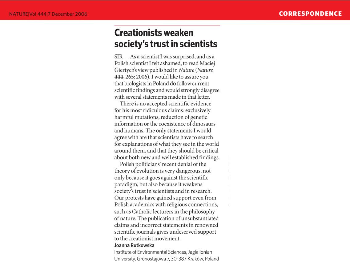 Polish weekly WPROST's feature article covers sex adjustment in birds and mammals focusing on Joasia's past and present work. Nature (Dec 7) publishes her letter on evolutionary biology and creationism in science and education.